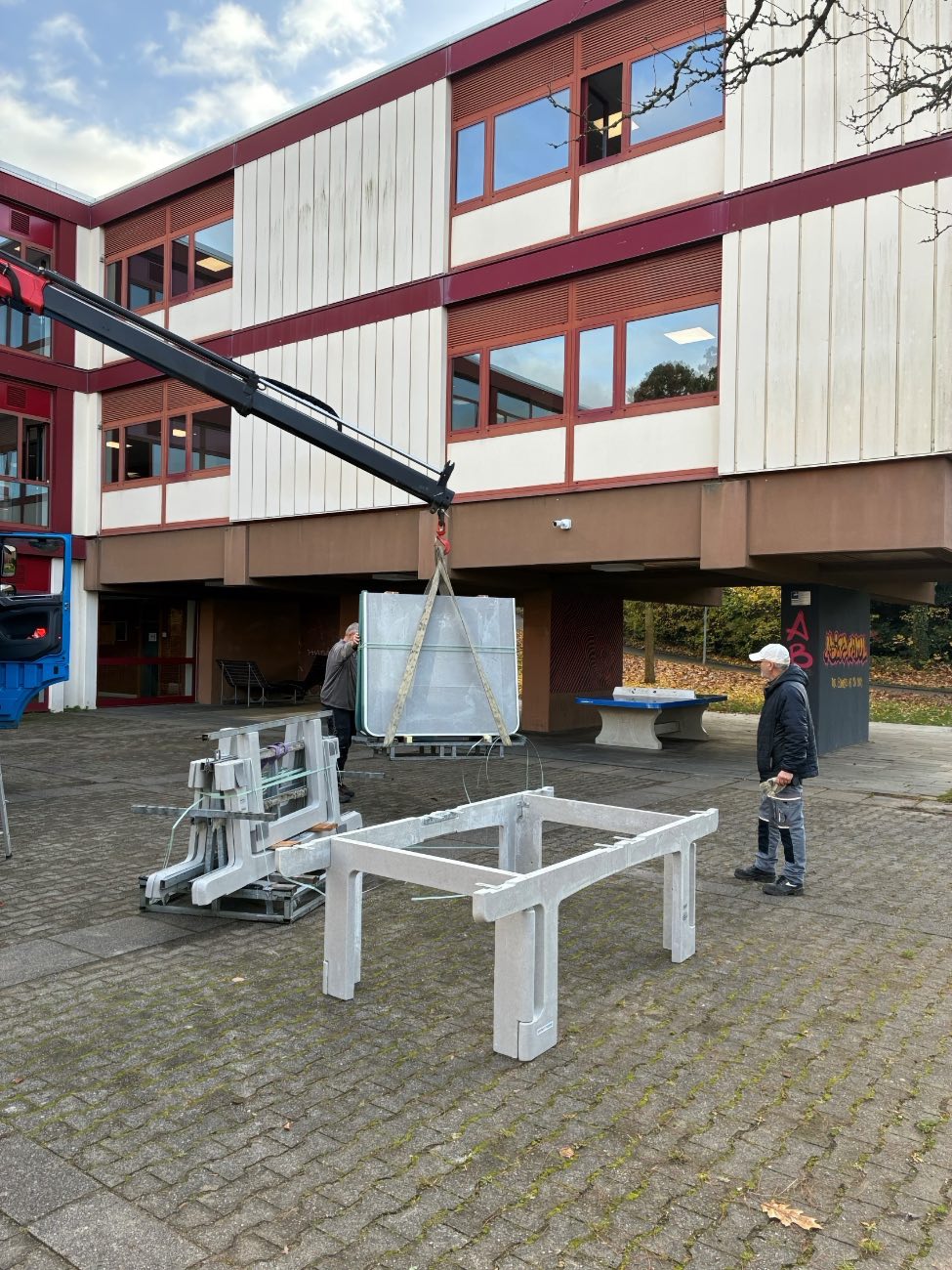 Die SMV des Goethe-Gymnasiums hat bereits im vergangenen Schuljahr zwei Outdoor-Tischtennisplatten bestellt, die Mitte November nun geliefert wurden. Diese beiden Tischtennisplatten sind aus Beton und daher witterungsbeständig.