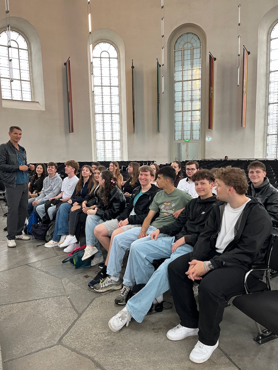 Frankfurt am Main, 04.06.2025 – trotz hessischem Regenwetter erlebte der Leistungskurs Gemeinschaftskunde am vergangenen Mittwoch eine hochinteressante und lehrreiche Exkursion in die Finanz- und Demokratiemetropole Frankfurt am Main. Der Tag begann hoch hinaus – oder sollte es zumindest. Der geplante Besuch der Aussichtsplattform des Main Towers musste zwar den dichten Wolken und Regenschauern etwas Tribut zollen, bot dennoch bereits von unten beeindruckende Einblicke in Frankfurts Skyline und ihre Bedeutung als wirtschaftliches Herz Deutschlands. Weiter ging es in Sachen Demokratiegeschichte in der Paulskirche.
