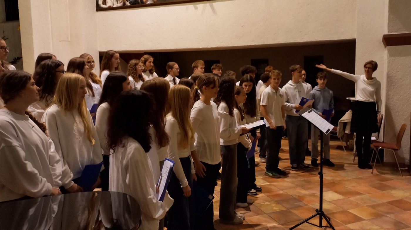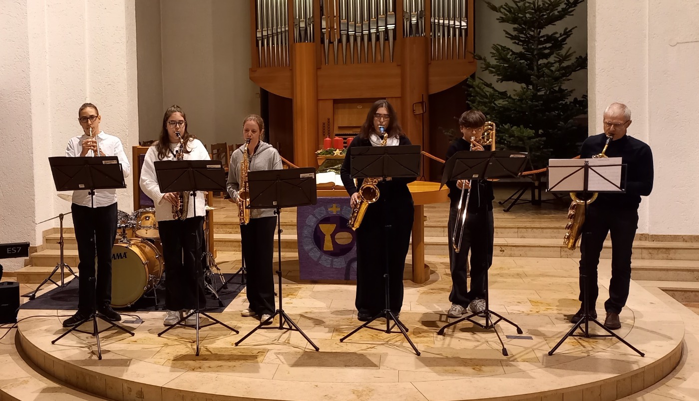 Die kleine, aber sehr feine Big Band zeigte ihren bewährten hervorragenden Sound und lud zum gut gelaunten Mitschwingen ein, bevor sich der Leistungskurs Musik präsentierte, verblüffend im Arrangement für Violine, Horn, Tenorhorn und Schlagzeug. Mit dem gemeinsam gesungenen Lied „Hört der Engel helle Lieder“ fand das Konzert seinen traditionellen Abschluss.