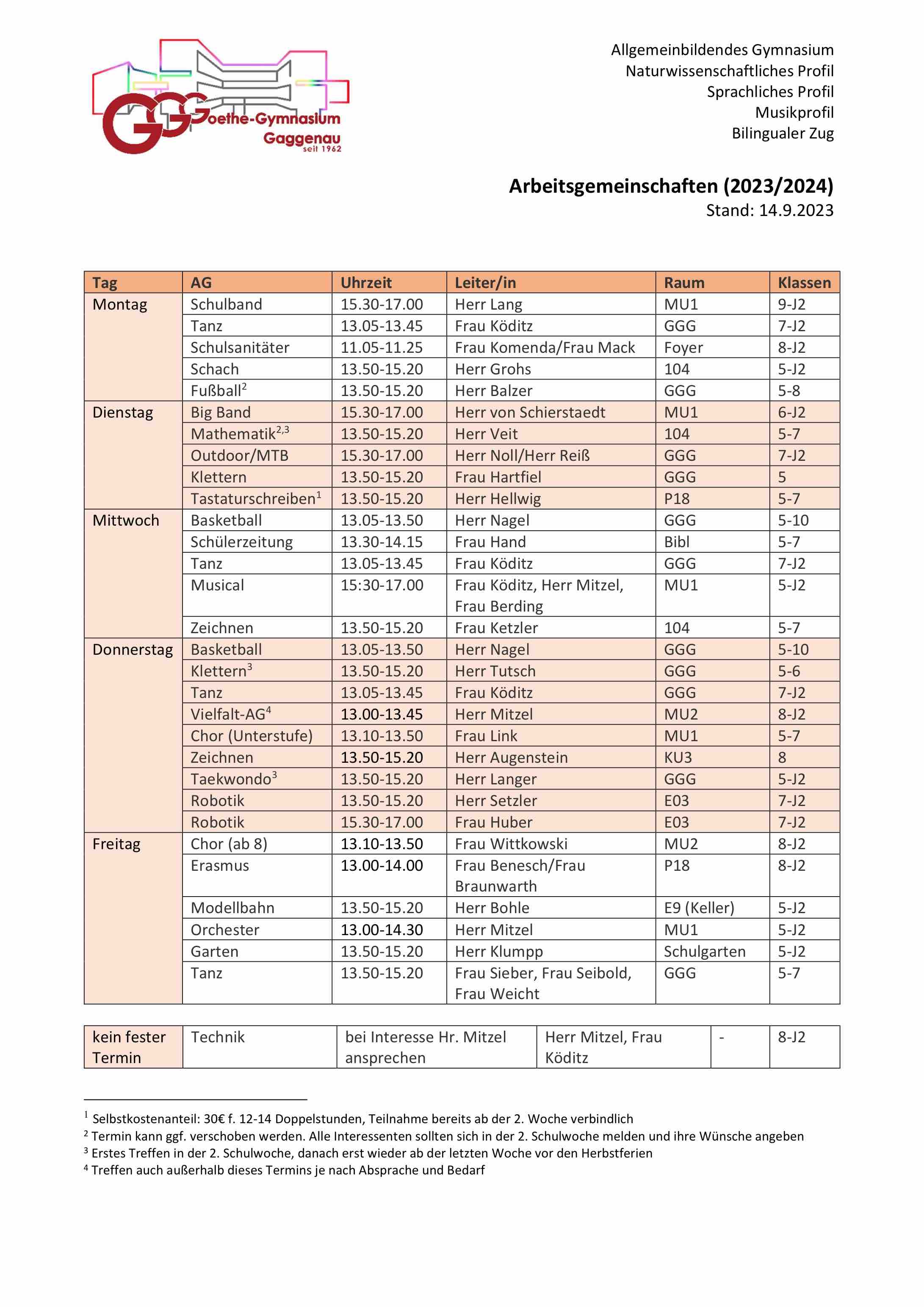 Ein Austritt aus einer AG, bzw. ein Wechsel innerhalb des AG-Angebots während des Schuljahres ist nur in begründeten Ausnahmefällen möglich.
