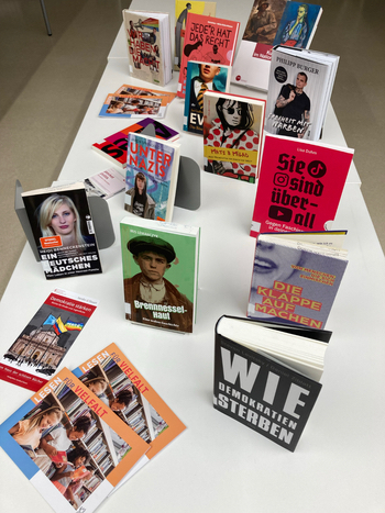 Jugendromane, Lexika, Mangas, Sachbücher, Wissensmagazine, fremdsprachige Bücher, Spiele, Kunstzeitschriften – unsere Schulbibliothek bietet ein reichhaltiges Angebot für jeden Geschmack. Nicht nur Unterhaltung, sondern auch Information und Bildung stehen bei uns im Mittelpunkt. Aktuell lädt ein thematisch gestalteter Büchertisch dazu ein, sich mit einem zentralen Aspekt unseres Zusammenlebens auseinanderzusetzen: Demokratie.
